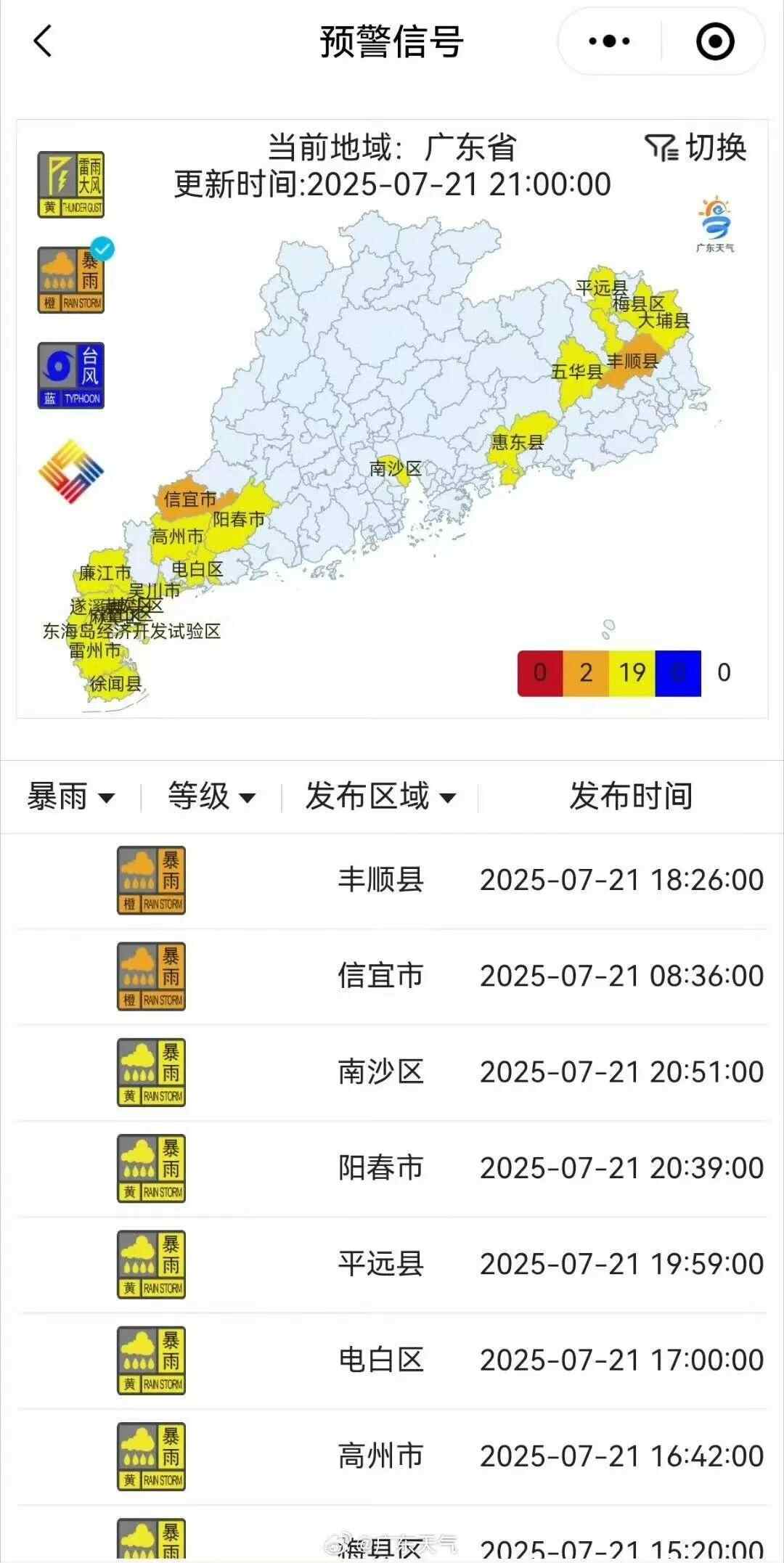 据@广东天气,21日晚间广东上空雷雨云团多点开花。截至21点,广东省有21个暴雨预警信号生效中,其中丰顺和信宜暴雨橙色预警信号生效中;另外还有2个雷雨大风预警信号生效中。