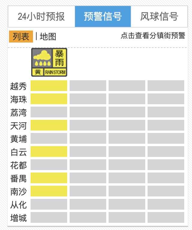 截至7月21日22时44分,越秀、海珠、天河、白云、番禺、南沙等区,已经发布暴雨黄色预警信号。结合广州市气象台7月21日21时45分发布的短时天气预报,预计7月21日夜间余下时间,广州阴天,有雷阵雨,局部雨势较大,气温25~27℃。