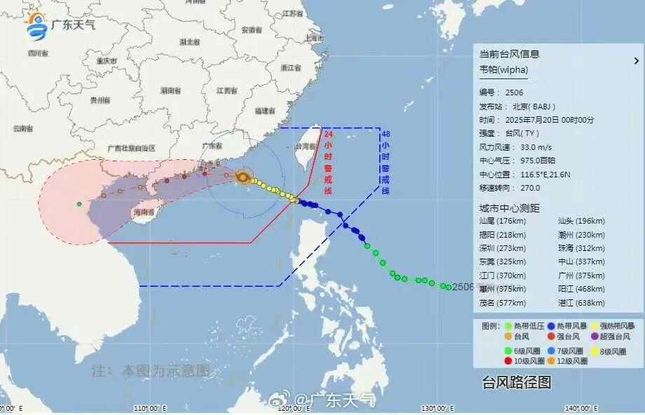 广州市南沙区气象台表示,台风“韦帕”已于7月19日23时升级为台风级,其中心位于南沙东偏南方向约340公里的海面上,中心附近最大风力12级(33m/s)。预计,“韦帕”将向西偏北方向移动,20日下午至夜间以台风或强台风级在深圳到湛江一带沿海登陆。受其影响,20日至21日南沙区有暴雨到大暴雨,陆地阵风9~10级,沿海、港区和高地阵风11~12级,大风影响主要时段为20日白天到21日凌晨。从7月19日23时50分起,南沙区台风黄色预警信号升级为橙色,请继续做好防御工作。
