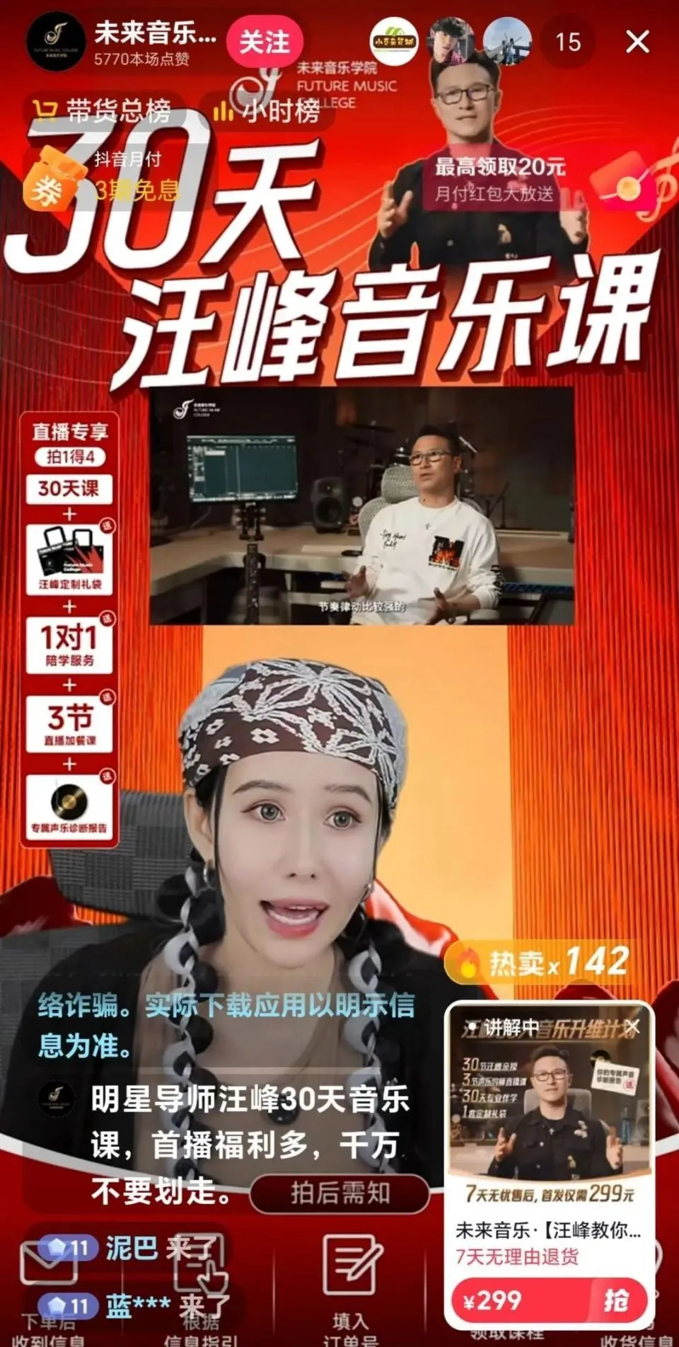 据悉,汪峰的音乐课在抖音平台一家名为“未来音乐学院”的店铺售卖。该音乐课程包含声乐、基础乐理、词曲创作、音乐历史等,整套课程包含30节汪峰亲自讲解的录播课加3节专业音乐老师的直播课,售价为299元。不过,购买事项显示,这一课程有效期仅一年。