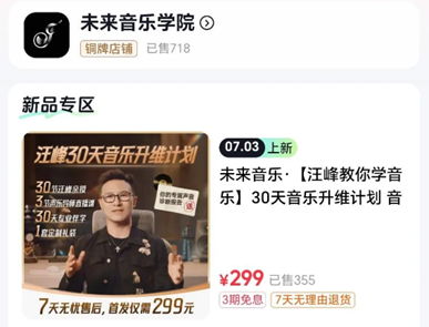 据悉,汪峰的音乐课在抖音平台一家名为“未来音乐学院”的店铺售卖。该音乐课程包含声乐、基础乐理、词曲创作、音乐历史等,整套课程包含30节汪峰亲自讲解的录播课加3节专业音乐老师的直播课,售价为299元。不过,购买事项显示,这一课程有效期仅一年。