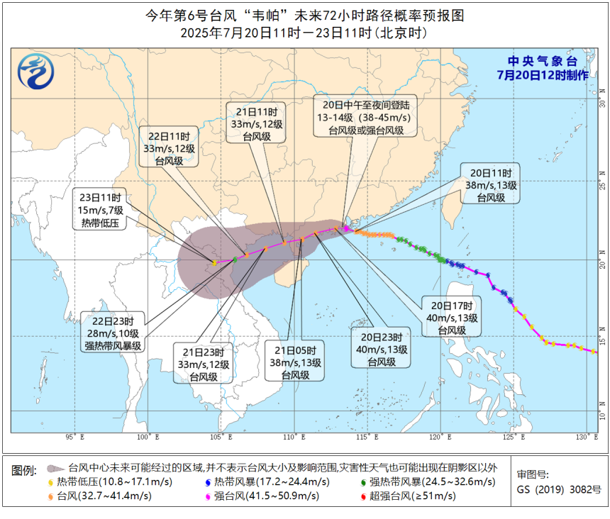 中央气象台预计,“韦帕”即将于20日中午至夜间,在广东珠海到湛江一带沿海登陆(13~14级,38~42米/秒,台风级或强台风级),最大可能在广东珠海到阳江一带沿海登陆,随后将于21日白天移入北部湾海面,并将于22日下午到夜间在越南东北部沿海登陆(强热带风暴级或台风级,11-12级,30-35米/秒)。