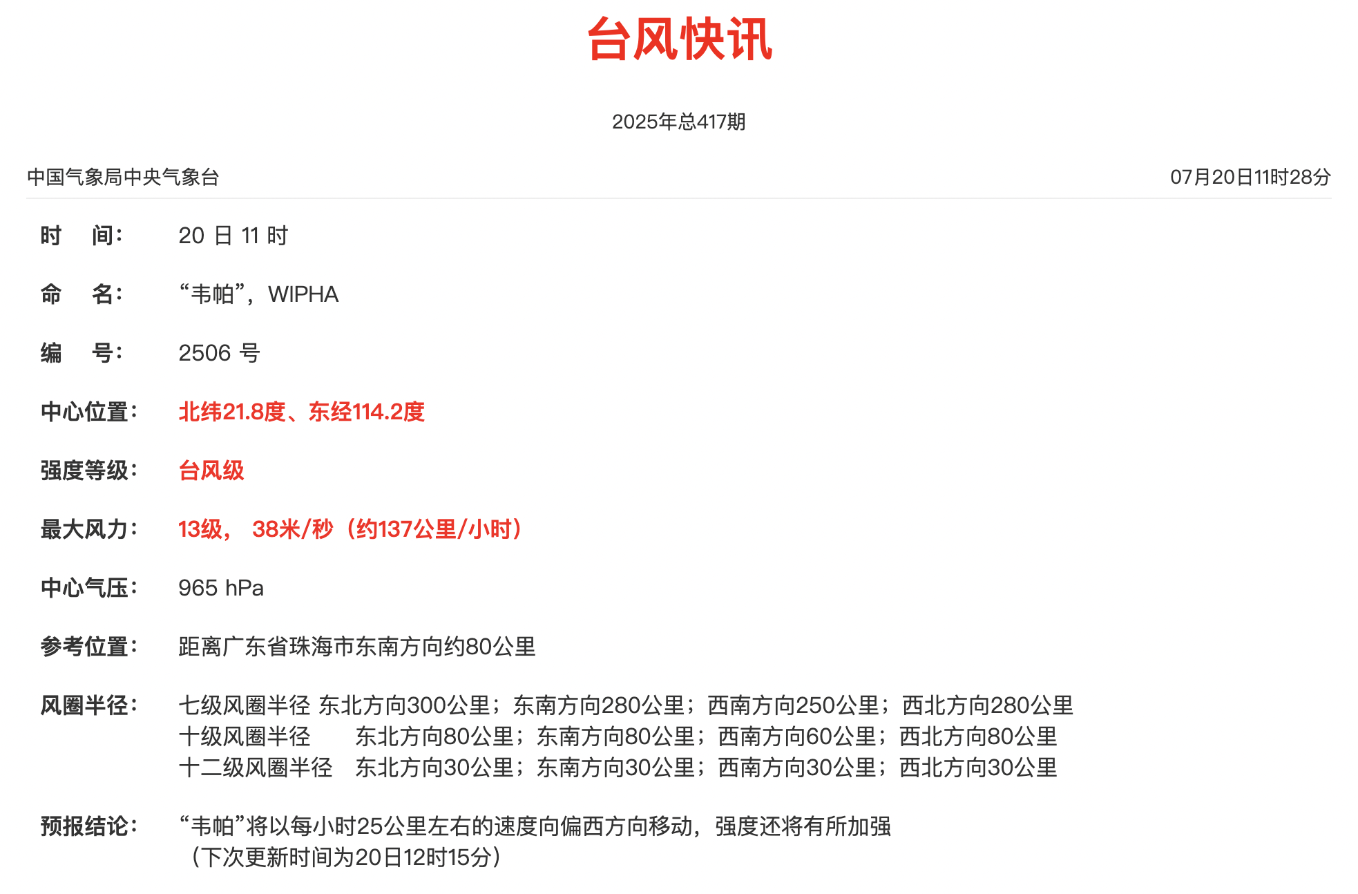 根据中央气象台7月20日11时28分发布的台风快讯,台风“韦帕”进一步加强为中心风力13级的台风。在20日11时,其中心距离广东省珠海市东南方向约80公里,预计将以每小时25公里左右的速度向偏西方向移动,强度还将有所加强。