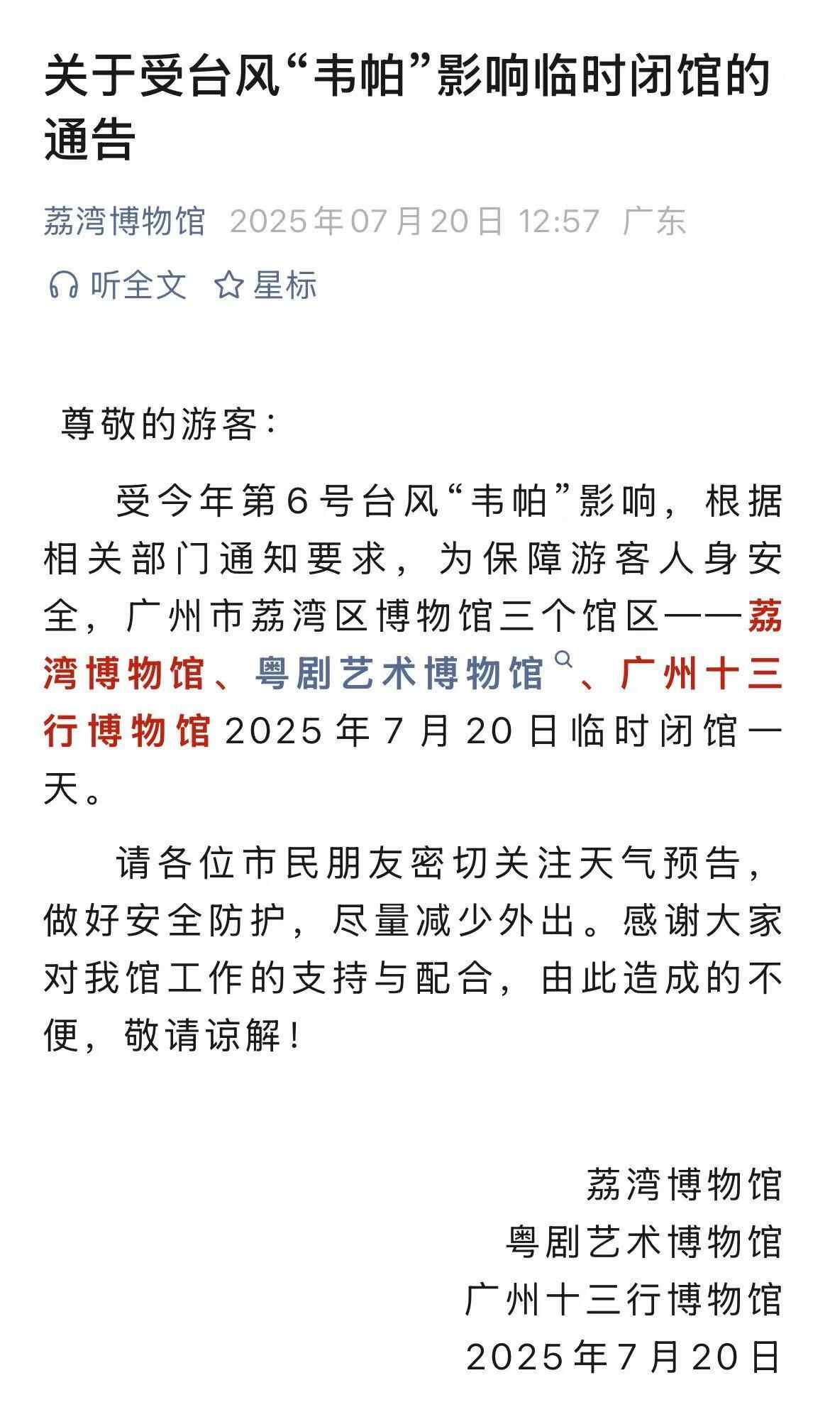 通告提到,受今年第6号台风“韦帕”影响,根据相关部门通知要求,为保障游客人身安全,广州市荔湾区博物馆三个馆区——荔湾博物馆、粤剧艺术博物馆、广州十三行博物馆于2025年7月20日临时闭馆一天。