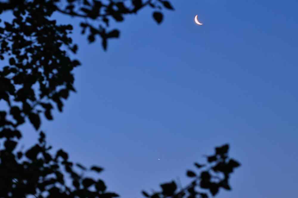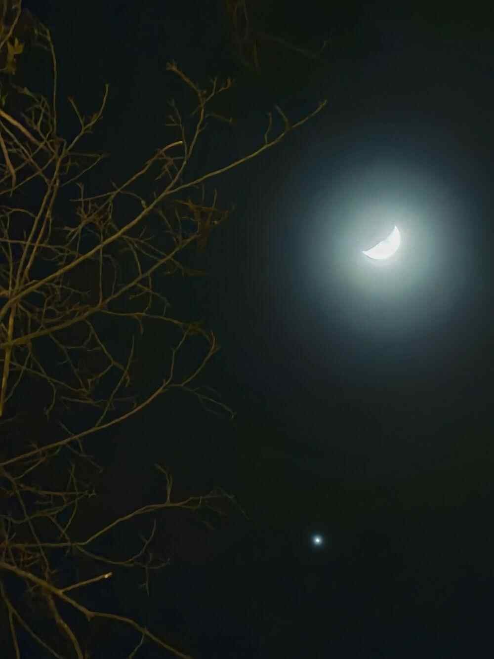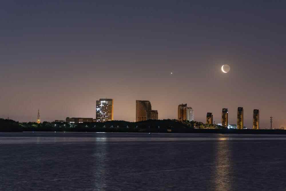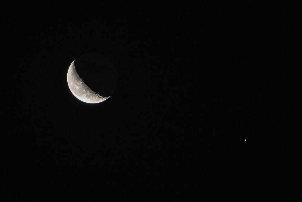 由于金星距离太阳较近,人们能用肉眼看到它的时间一般只能是黎明或傍晚,所以月球与之相伴时,要么是农历月初的蛾眉月,要么就是农历月末的残月,亮度均不高。