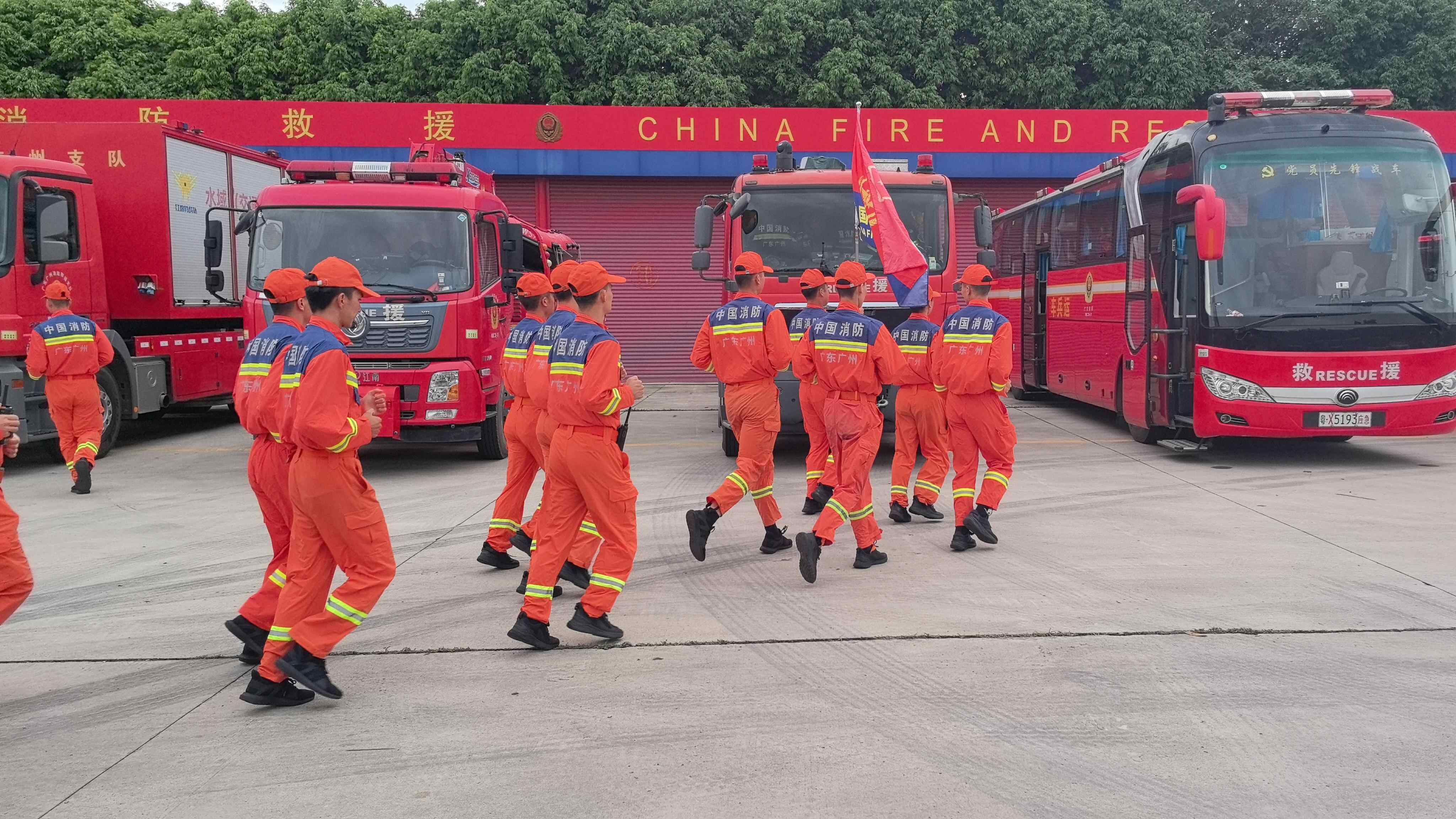 接到总队命令后,广州市消防救援支队迅速响应,第一时间集结支队全勤指挥部、特勤、黄埔、荔湾、花都、海珠、番禺、增城、白云、从化、重型机械工程救援大队等力量,于7月20日7时完成人员装备清点及战前动员,随即火速出发驰援茂名。