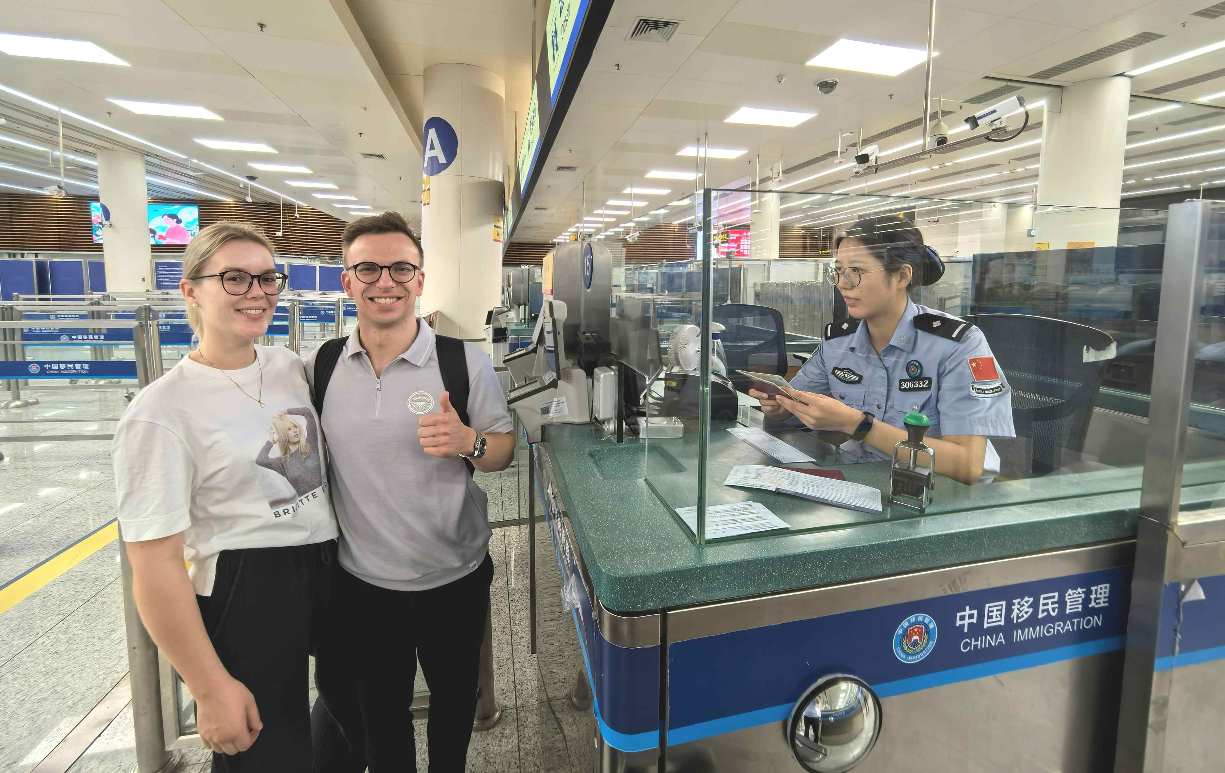 上午10时,福田口岸入境大厅,一对德国情侣推着行李箱步履匆匆来到验证台前,皇岗边检站执勤十一队民警快速为他们办理入境手续。两人兴奋地告诉民警,中国免签政策真好,他们享受政策便利,第一次来深圳度假,原以为今天台风天气通关会受阻,没想到比预期中还顺畅。