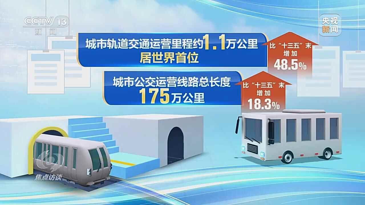 “十四五”期间,我国在客运方面创下多项世界第一:约有3.5亿人乘坐飞机出行,目前航空人口的数量达到4.7亿,成为全球航空人口最多的国家。城市轨道交通运营里程约1.1万公里、居世界首位;城市公交运营线路总长度达175万公里,比“十三五”末分别增加48.5%和18.3%。