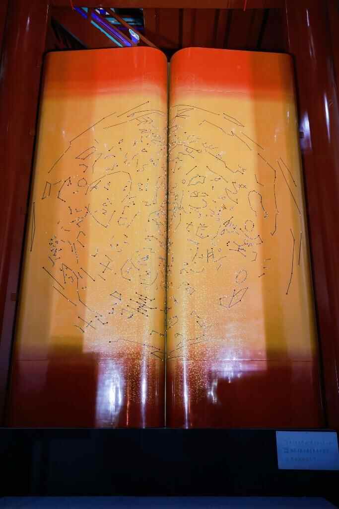 他们坚守漆艺的古老技法,融入当代公共艺术的表达形式,最终完成了高7.8米、宽5.6米的巨型漆画《永恒中轴》。“7.8米高呼应中轴线7.8公里的长度,5.6米宽则象征着56个民族团结一心。”林正佳介绍,整幅漆画犹如一本打开的书,“书”上的星图画面取材于《隆福寺藻井星宿图》。