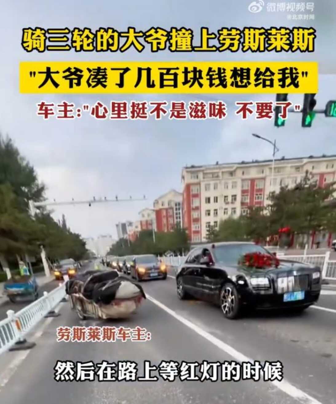 车主表示,当天早上自己帮朋友出婚车,等红灯的时候,大爷骑着三轮车撞到了自己的车上。“大爷当时想拍他们的车队,大意了没控制住车。”