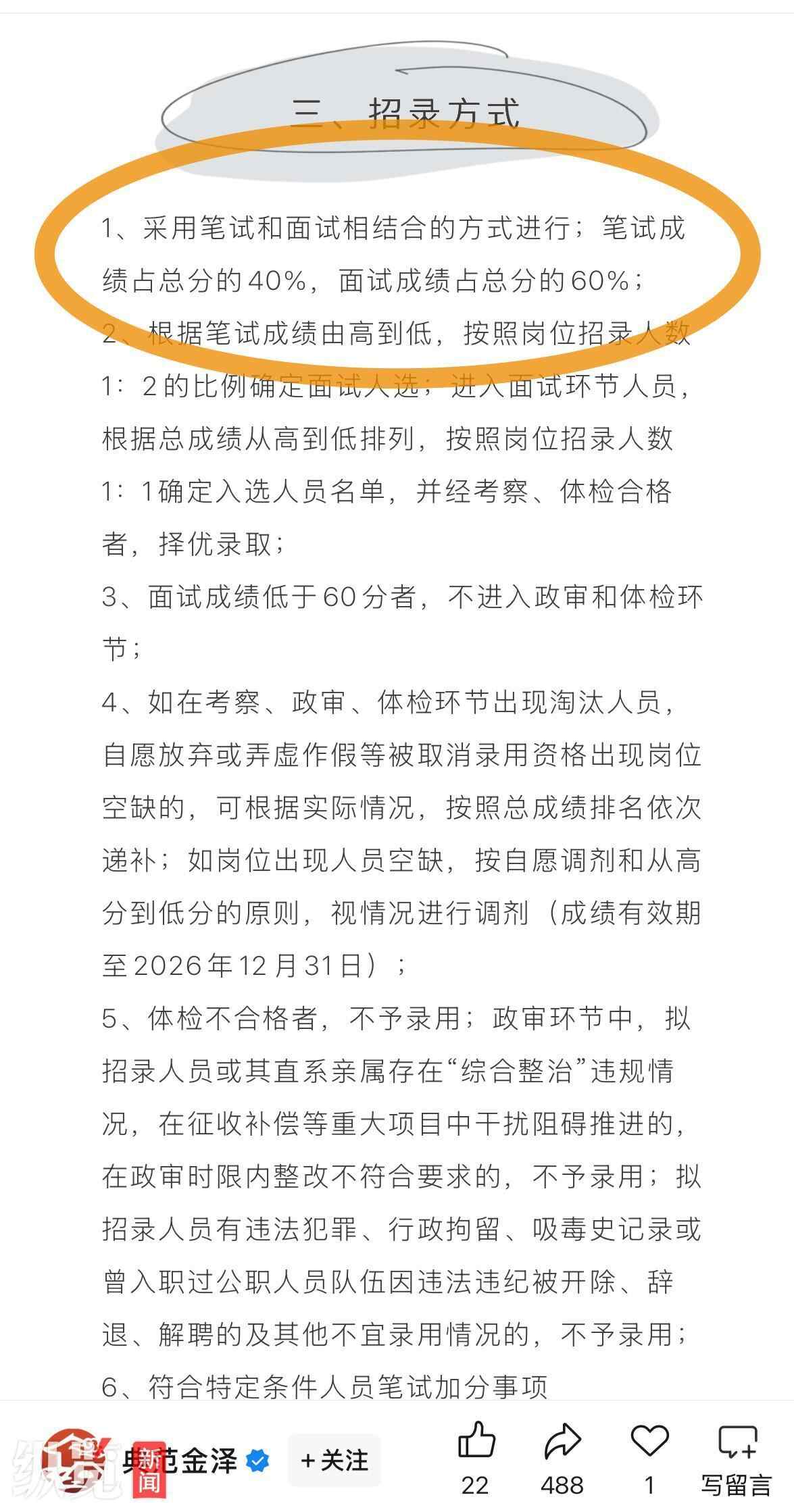 对于当天考试人数问题,该工作人员称,“当天是六个岗位在同一地点考试,所以总人数看着比较多”。招聘公告中提到,此次招聘根据笔试成绩由高到低,按照岗位招录人数1:2的比例确定面试人选。进入面试环节人员,根据总成绩从高到低排列,按照岗位招录人数1:1确定入选人员名单,并经考查、体检合格者,择优录取。