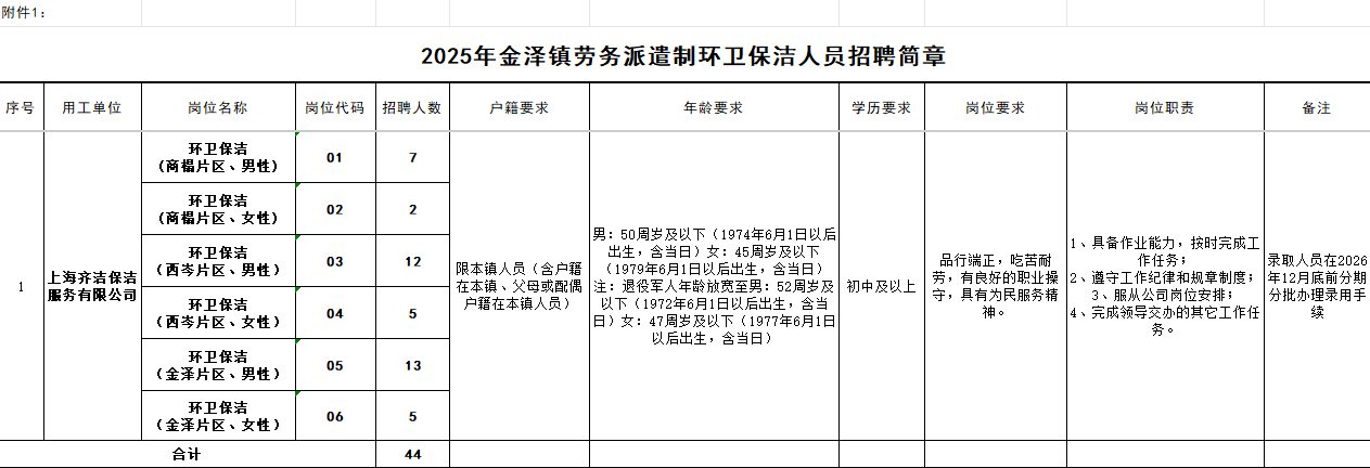 公告附件中的招聘简章显示,用工单位为上海齐洁保洁服务有限公司,记者在企查查APP查询到,上海齐洁保洁服务有限公司股东为上海青浦区金泽经济联合社。公开报道显示,该保洁公司主要负责金泽镇的环卫工作。