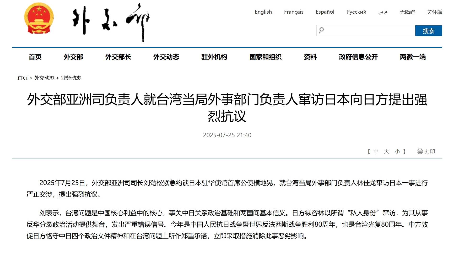 2025年7月25日,外交部亚洲司司长刘劲松紧急约谈日本驻华使馆首席公使横地晃,就台湾当局外事部门负责人林佳龙窜访日本一事进行严正交涉,提出强烈抗议。