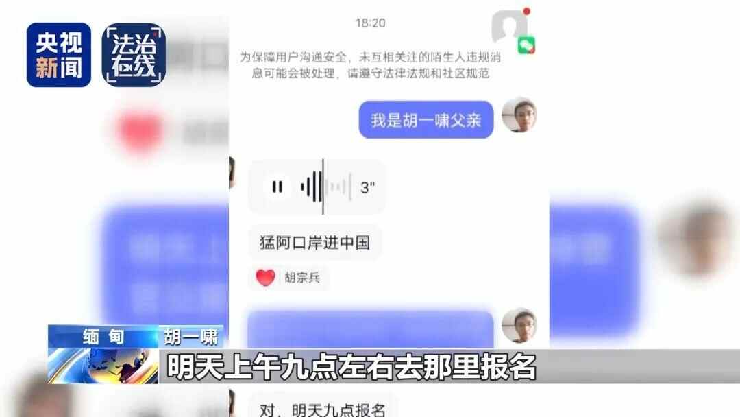 胡一啸父亲 胡宗兵:他(说)缅甸那边有人,也有武装势力,所以跟我说了会怎么去营救这个人。他没有说找这个人,他说营救。他说跟那边谈判,多少钱能谈成功最好,如果谈不妥,他们就查到地方抢人,贿赂电诈园区的人,车子等在那里就抢。