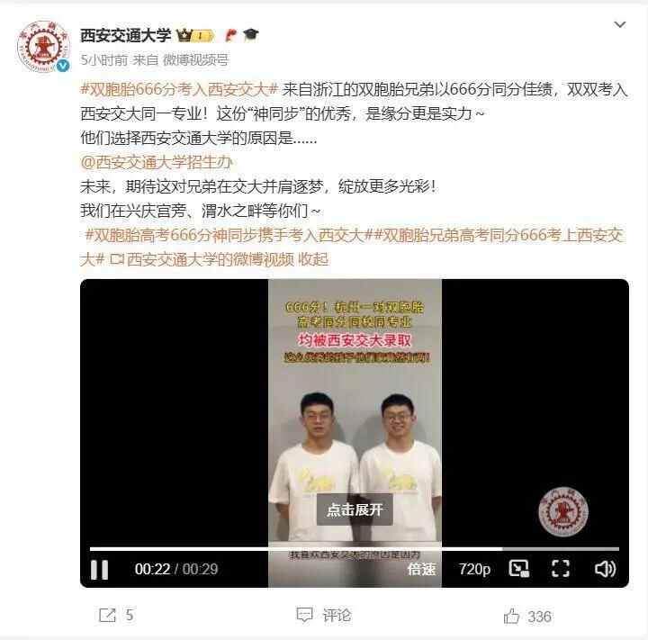 7月25日下午,西安交通大学官方微博也发文祝贺了两位学子:“来自浙江的双胞胎兄弟以666分同分佳绩,双双考入西安交大同一专业!这份神同步的优秀,是缘分更是实力。未来,期待这对兄弟在交大并肩逐梦,绽放更多光彩!我们在兴庆宫旁、渭水之畔等你们。”