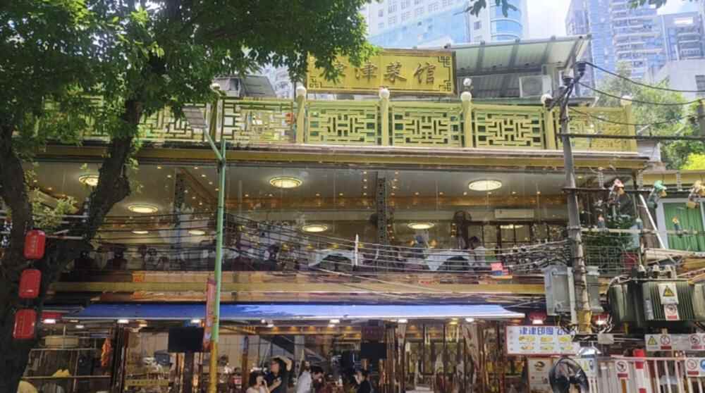 津津菜馆烟火气十足。招牌白切鸡皮爽肉滑,蘸上特制姜葱酱尽显本味;脆皮炸大肠外酥里嫩,两道经典小炒展现了西关美食的“家常功夫”。