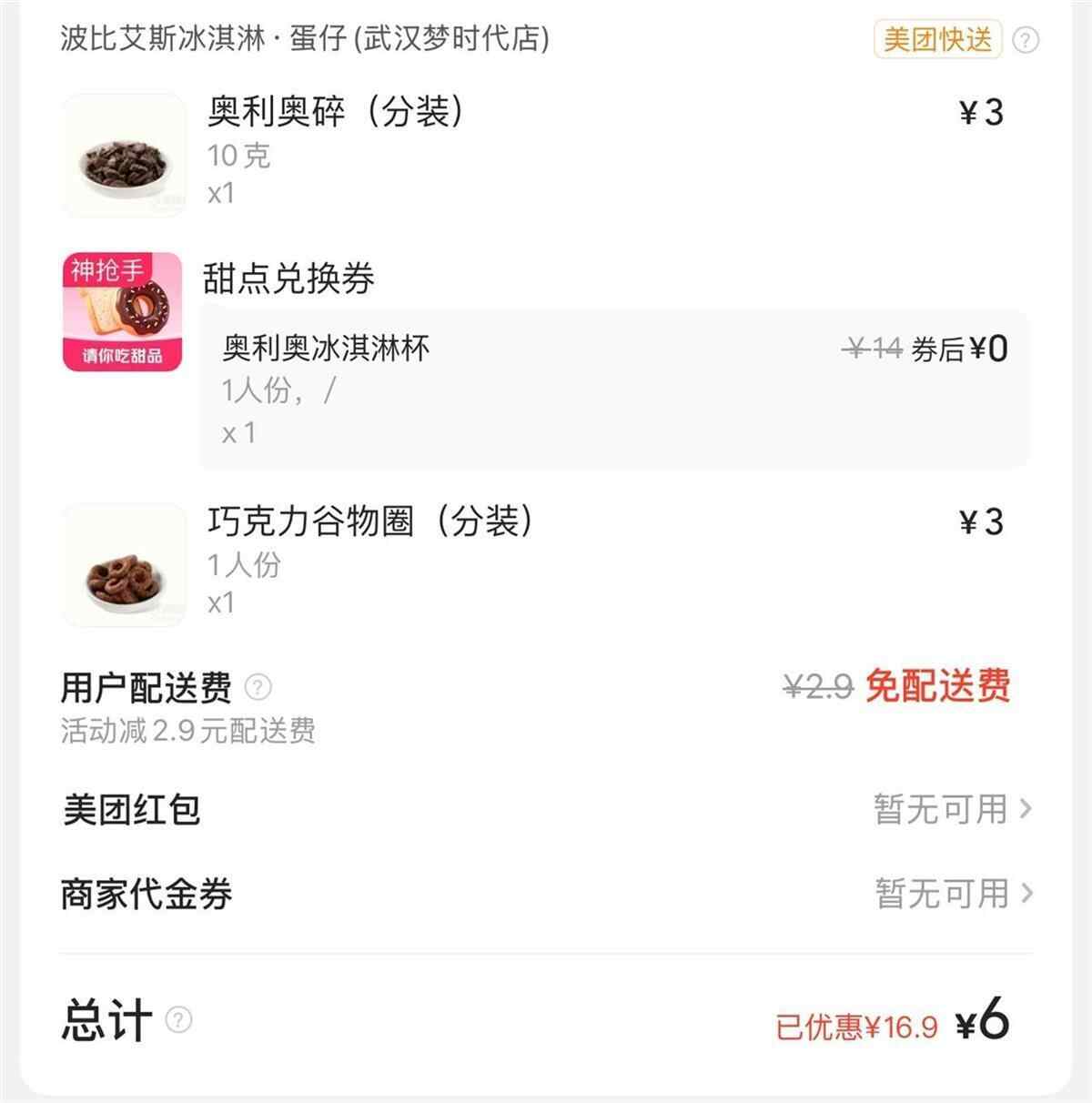 以参与活动的波比艾斯冰淇淋为例,可用券兑换一个原价14元的“奥利奥冰淇淋杯”,但达不到商家的满20元的起送门槛。记者又加购了奥利奥碎、巧克力谷物圈两款各3元的小料,凑够起送门槛后,在免配送费的情况下,最终需支付6元。