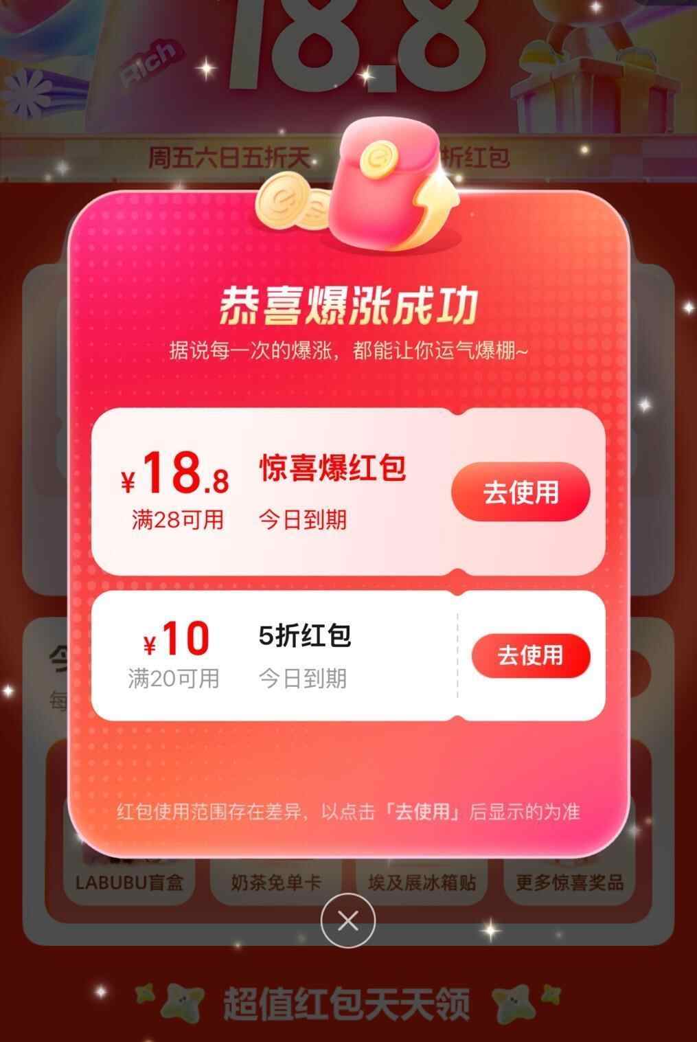 记者打开淘宝闪购,领取到“满38减18.8元”的爆涨红包,188元券包中按满减力度来算,折扣最大的仅为一张“满20元减10元”的“奶咖自由红包”,其他红包力度甚至不到5折。饿了么上则领到了“满28元减18.8元”的爆涨红包。