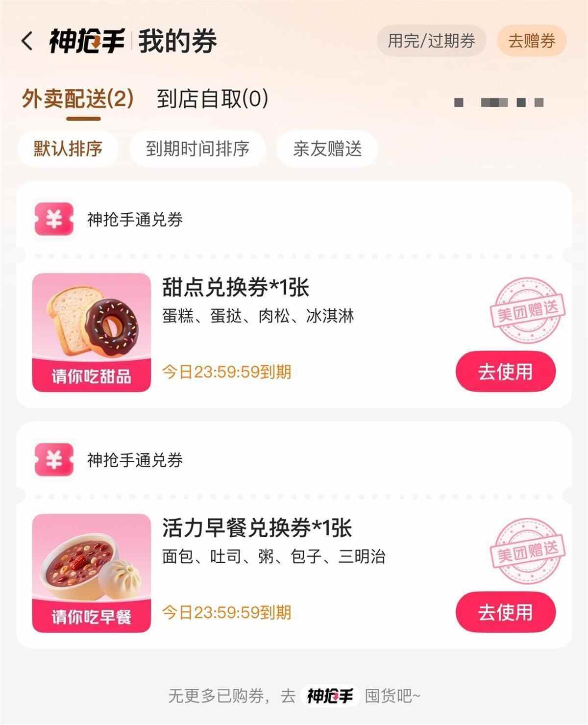 当日8时许,记者打开美团外卖,弹出“外卖好礼已到账”红包,点开领取到外卖配送“甜点兑换券”“活力早餐兑换券”各1张。可兑换蛋糕、蛋挞、肉松、冰淇淋、面包、粥、三明治等品类,但仅限部分商家的指定甜点、早餐。