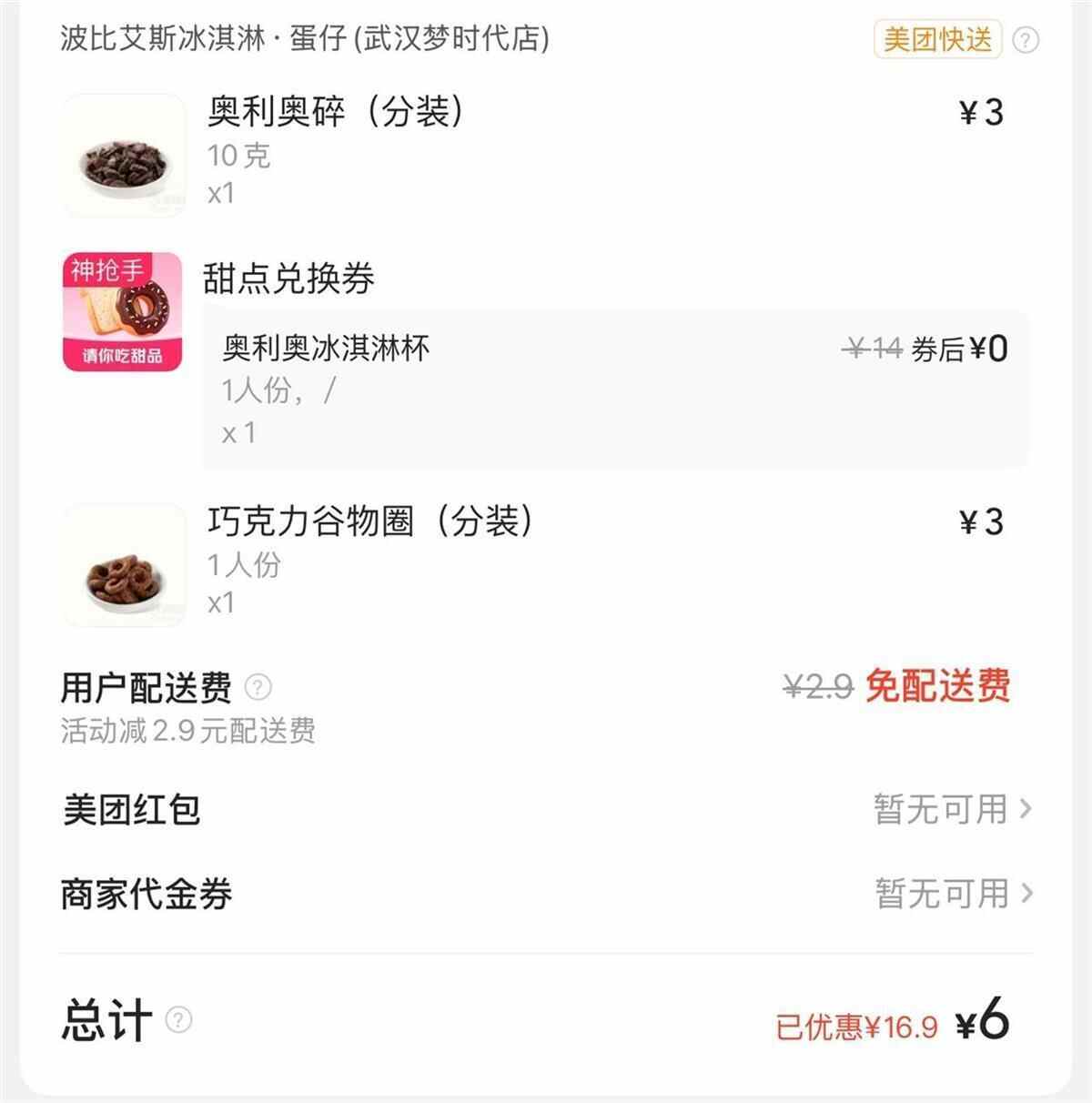以参与活动的波比艾斯冰淇淋为例,可用券兑换一个原价14元的“奥利奥冰淇淋杯”,但达不到商家的满20元的起送门槛。记者又加购了奥利奥碎、巧克力谷物圈两款各3元的小料,凑够起送门槛后,在免配送费的情况下,最终需支付6元。