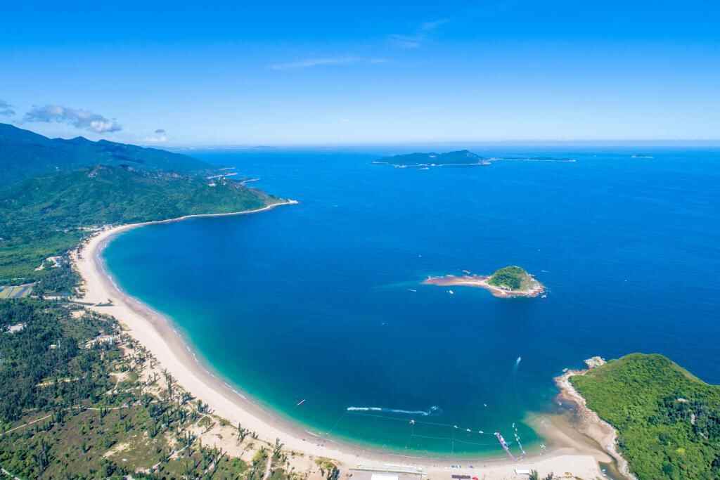 桔钓沙三面青山环绕,沙滩呈月牙状,沙质细腻如银,被誉为"银滩"。