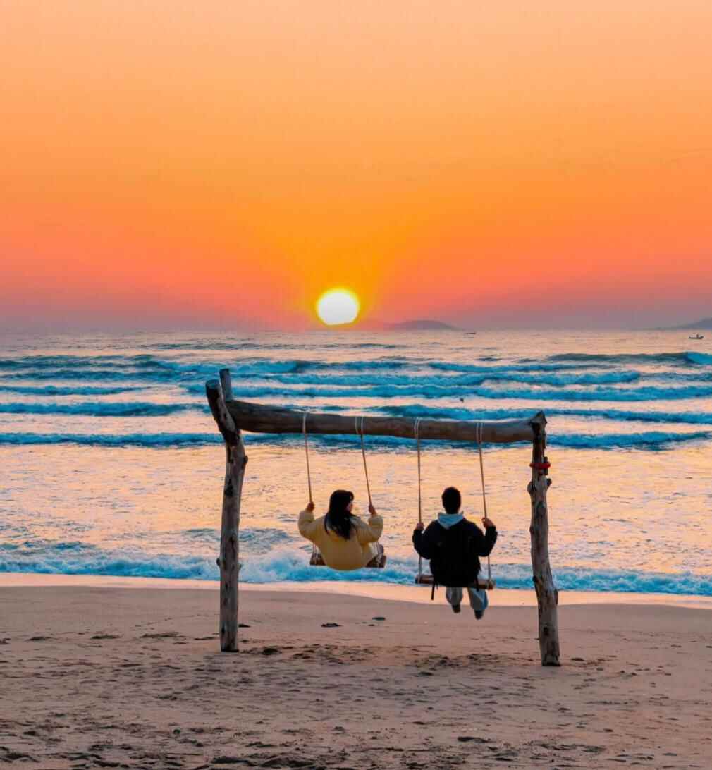 马尾岛海滩海浪平缓,水中安全地带宽阔,容易形成"天空之镜"的景观。日落晚霞漫天时,一组"马尾夕照"让你秒出大片。
