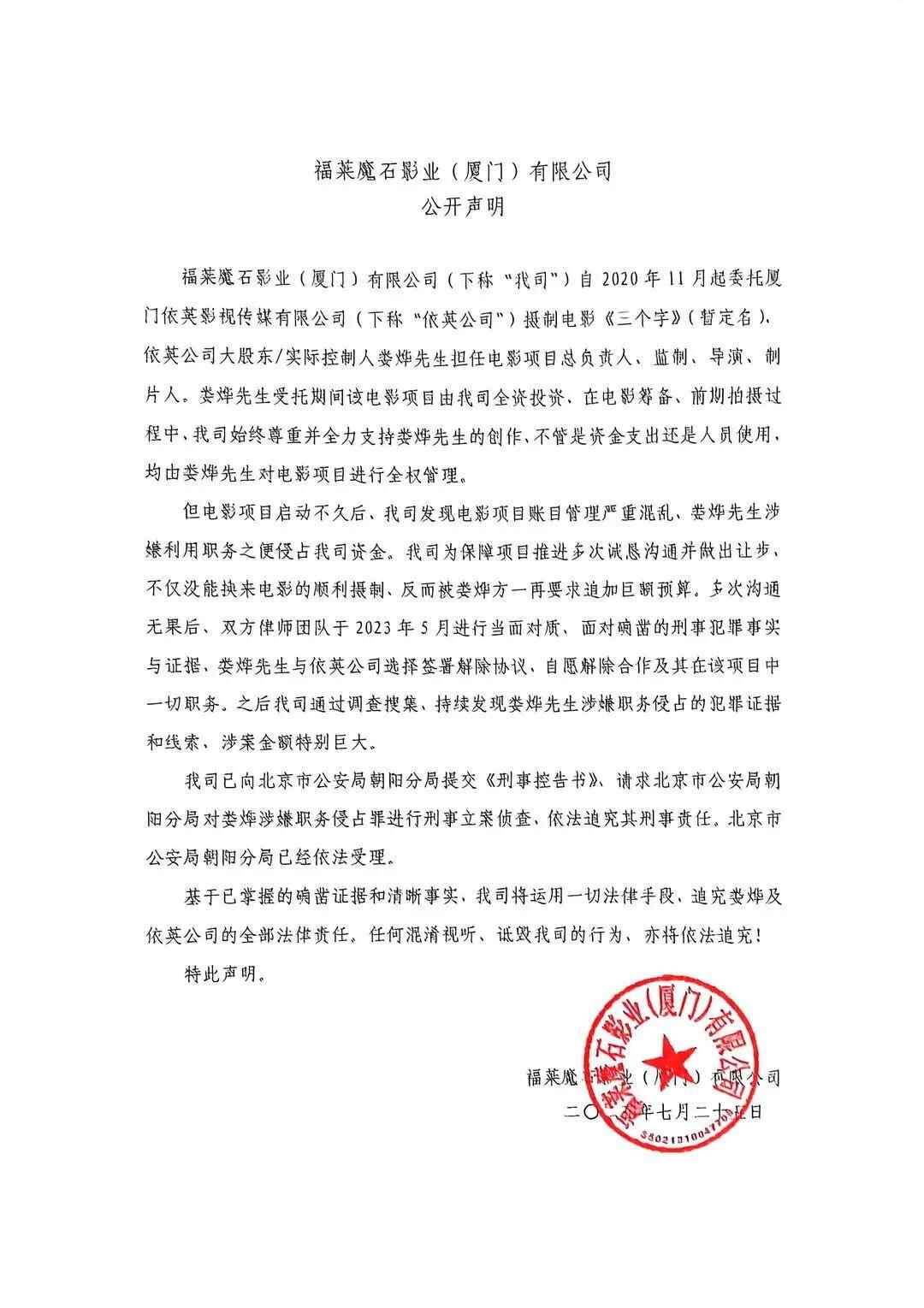 7月25日,福莱魔石影业(厦门)有限公司发出公开声明,表示该公司自2020年11月起委托娄烨担任电影《三个字》(暂定名)的总负责人、监制、导演、制片人。娄烨受托期间,该电影项目由福莱魔石影业全资投资。