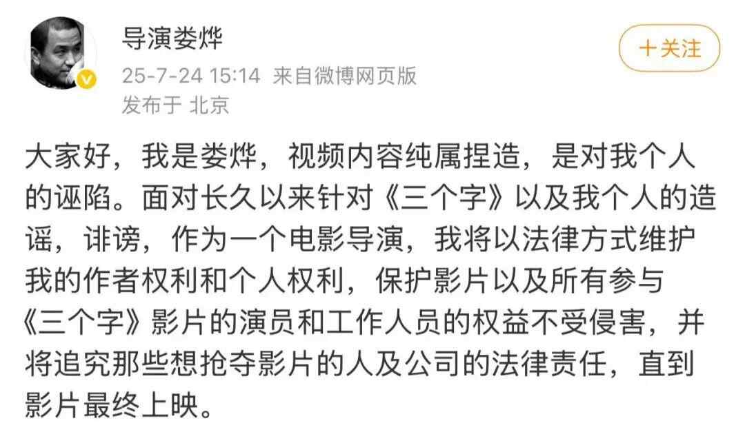 7月24日,娄烨回应称该爆料纯属捏造,是对他个人的诬陷。他将以法律方式维护他的作者权利和个人权利,保护影片以及所有参与《三个字》影片的演员和工作人员的权益不受侵害,并将追究那些想抢夺影片的人及公司的法律责任,直到影片最终上映。
