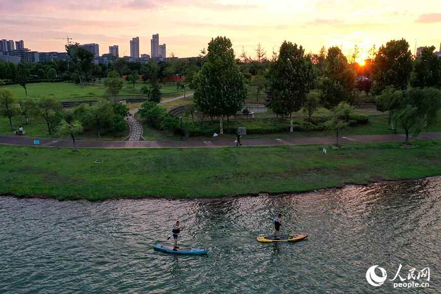人民网南昌7月26日 (记者时雨)25日傍晚,夕阳下的江西省南昌市红谷滩区九龙湖泛着金色波光,桨板爱好者们挥动桨板在静谧的湖面上划行,构成了一幅动人的城市画卷。