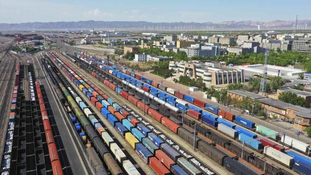 在新疆阿拉山口站宽准轨编组场,出入境中欧班列集结等待出发(2024年5月25日摄,无人机照片)。新华社发(于晖 摄)