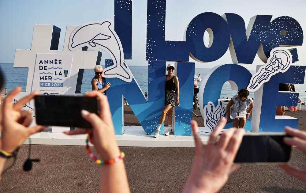 6月10日,在法国尼斯的盎格鲁街上,人们在国际海洋年和第三届联合国海洋大会主题的景观前拍照。新华社记者 高静 摄