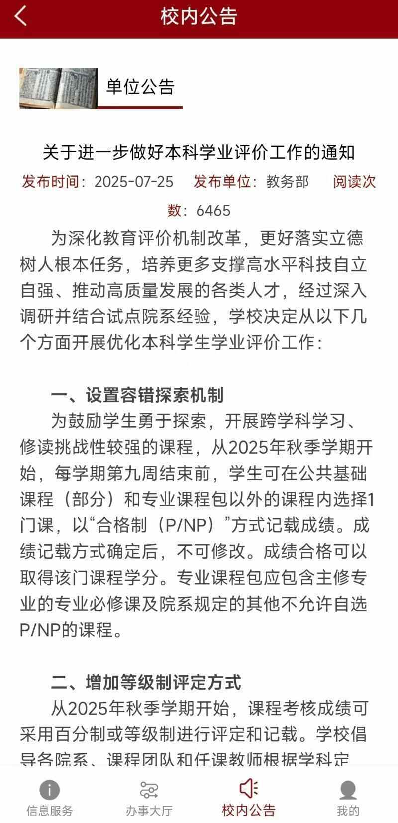 通知称,为鼓励学生更好地探索发展方向、发挥个人禀赋,不以单一标准评价学生学业能力,自在学年级为2025级的学生开始,学生学业情况将由成绩单完整体现,在各类含有学业评价的工作中不再使用绩点,不再设置指导性课程成绩优秀率指标……