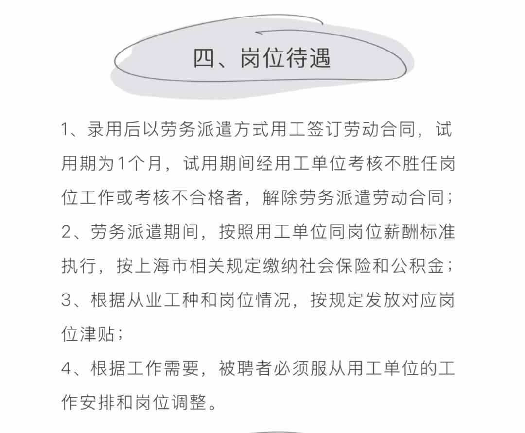 公告显示,录用后以劳务派遣方式用工签订劳动合同,试用期为1个月,试用期间经用工单位考核不胜任岗位工作或考核不合格者,解除劳务派遣劳动合同;劳务派遣期间,按照用工单位同岗位薪酬标准执行,按上海市相关规定缴纳社会保险和公积金;根据从业工种和岗位情况,按规定发放对应岗位津贴。