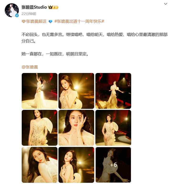 7月26日,@张碧晨Studio 发文纪念张碧晨出道11周年,“不必回头,也无需多言。继续唱吧,唱给明天、唱给热爱、唱给心里最清澈的那部分自己。”疑似再回应《年轮》原唱风波。