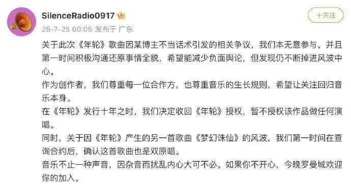 作为创作者,我们尊重每一位合作方,也尊重音乐的生长规则,希望让关注回归音乐本身。在《年轮》发行十年之时,我们决定收回《年轮》授权,暂不授权该作品做任何演唱。