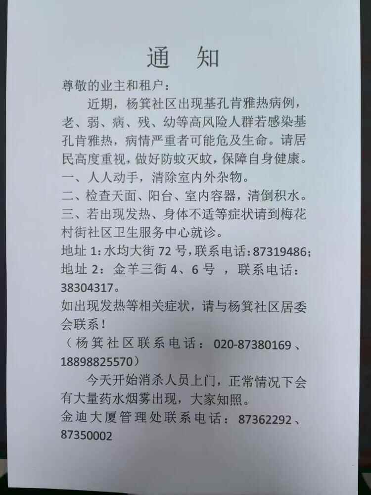 7月25日,广州越秀杨箕社区公布通知称,该社区出现基孔肯雅热病例,今日开始开展上门消杀工作,请居民自行清除杂物积水,做好防蚊灭蚊,保障自身健康。