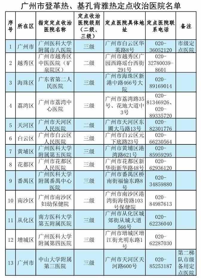 7月25日,广州市卫生健康委员会官方发布广州市登革热、基孔肯雅热定点收治医院名录,共有13家定点收治医院。