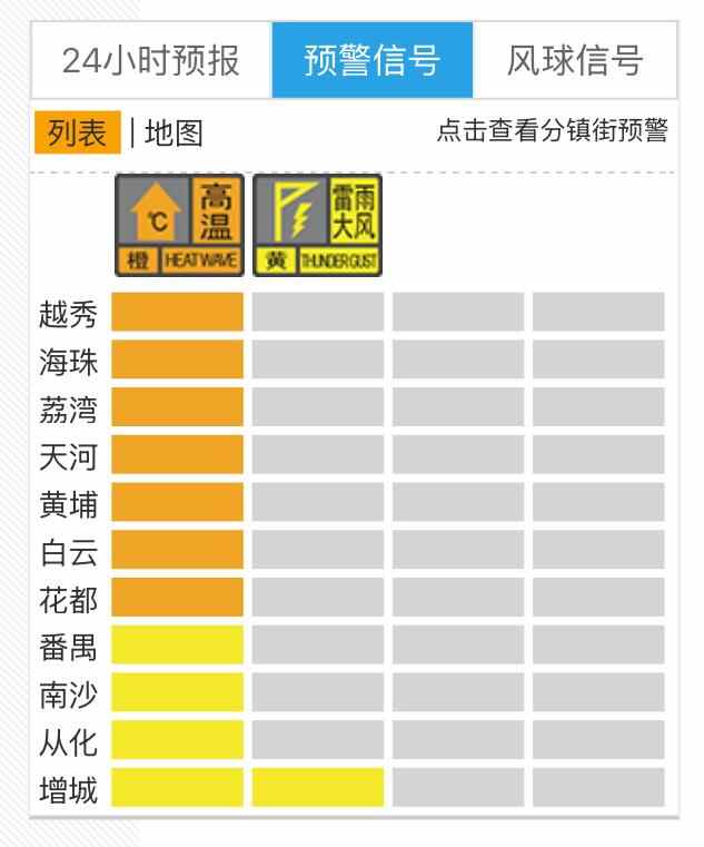 截至25日14时52分,越秀、海珠、荔湾、天河、黄埔、白云、花都等区,均已升级高温橙色预警信号,请市民做好防御工作,注意防暑降温