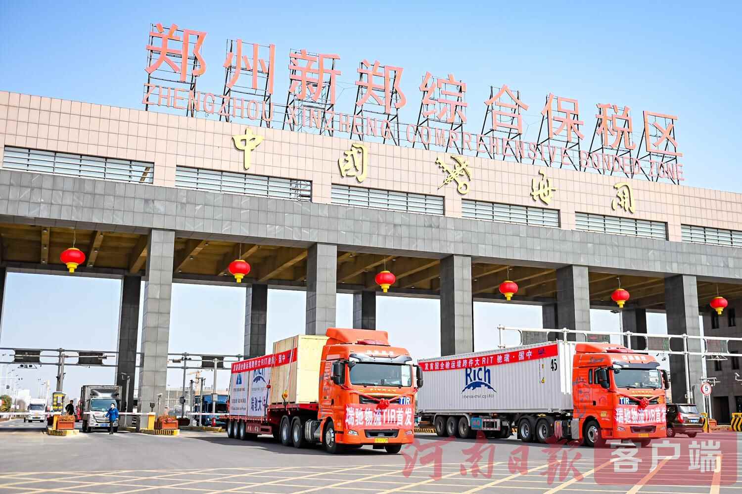 郑州经开综保区南去30公里,位于郑州航空港的郑州新郑综合保税区,一辆辆国际公路运输车辆从国际公路运输河南集结中心驶向世界。