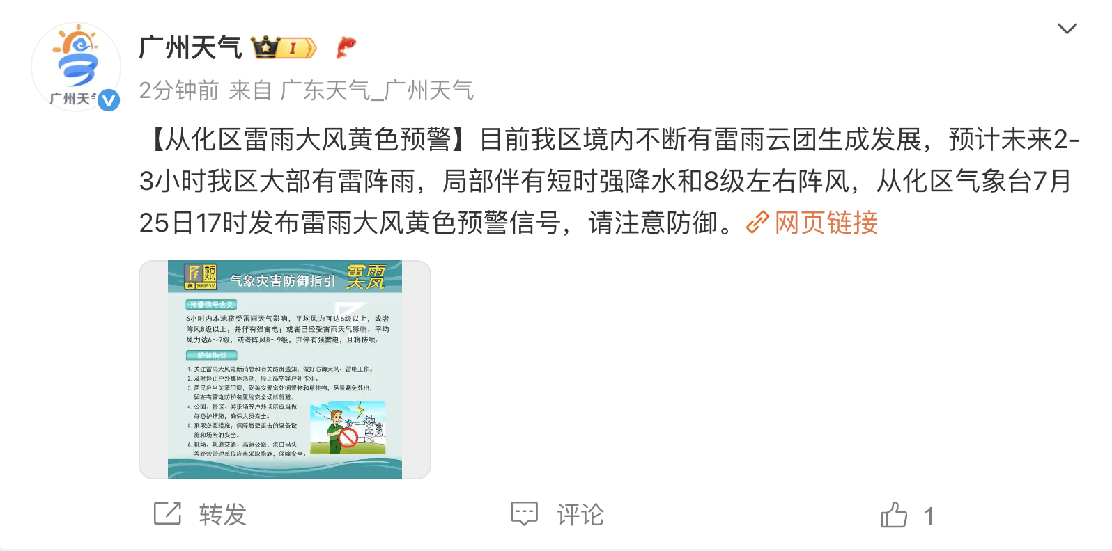 记者翻查信息发现,17时,从化区气象台发布雷雨大风黄色预警信号并指出,从化区境内不断有雷雨云团生成发展,预计未来2-3小时从化区大部有雷阵雨,局部伴有短时强降水和8级左右阵风。