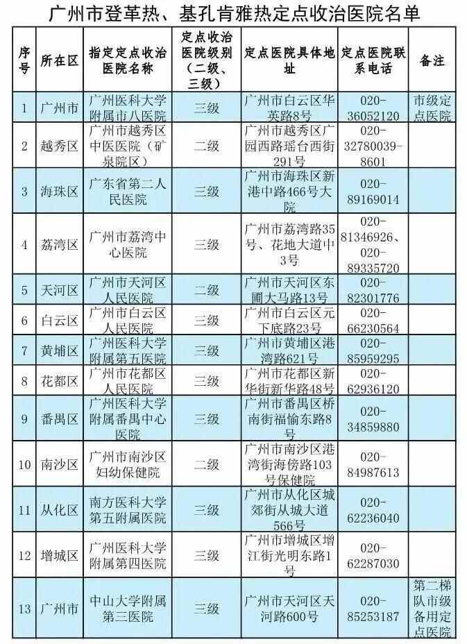 7月25日,广州市卫生健康委员会官方发布广州市登革热、基孔肯雅热定点收治医院名录,共有13家定点收治医院。