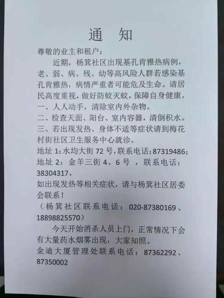 7月25日,广州越秀杨箕社区公布通知称,该社区出现基孔肯雅热病例,今日开始开展上门消杀工作,请居民自行清除杂物积水,做好防蚊灭蚊,保障自身健康。