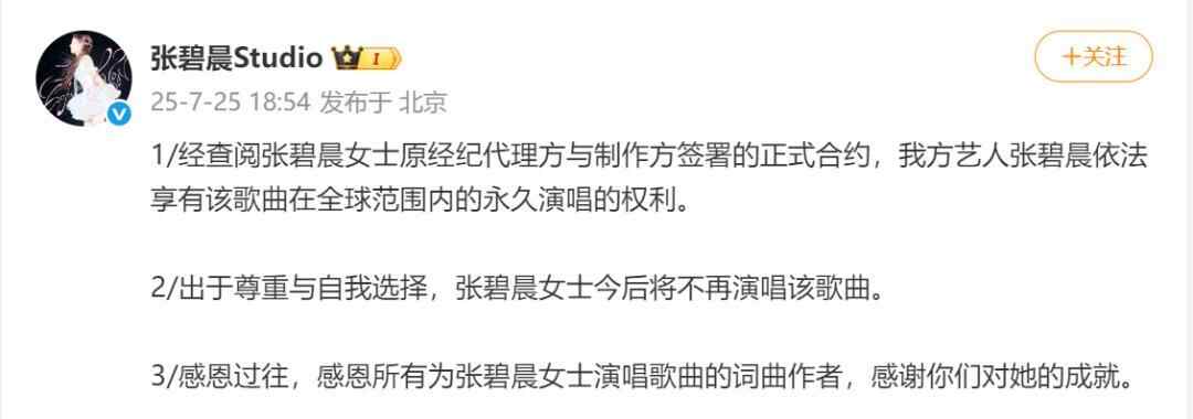 7月25日,@张碧晨 工作室就《年轮》歌曲引发的舆论争议作出回应,表示经查阅正式合约,张碧晨法享有该歌曲在全球范围内的永久演唱的权利,但出于尊重与自我选择,张碧晨今后将不再演唱该歌曲。 全文如下: