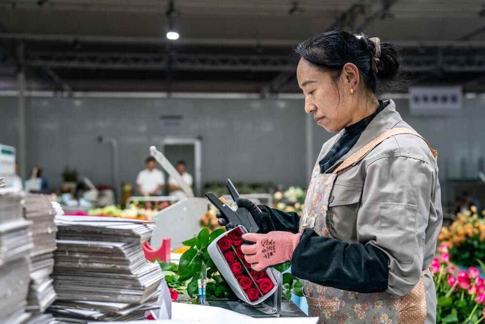 玫瑰、百合、洋桔梗等40多个品类、1500多种鲜切花的价格、评级信息在电子大屏上实时快速滚动。来自全国各地的采购商紧盯屏幕,不时按下抢拍键。拍卖结束后,鲜花马上进入打包环节,连夜发货。