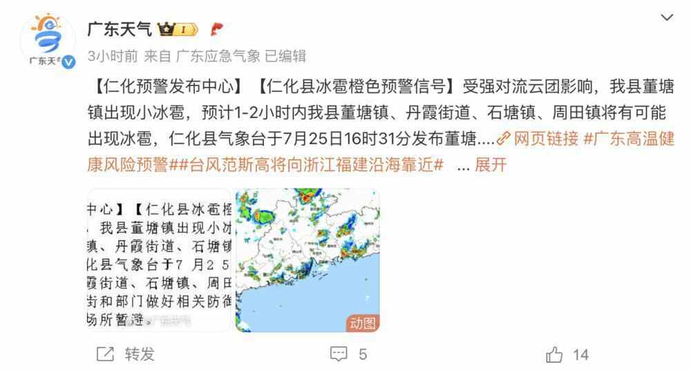 7月25日,广东大部继续高温炎热,其中梅州蕉岭录得全省最高气温38.0℃。但25日午后起,多地出现了分散雷阵雨,局部大雨或暴雨,雷雨时局地出现了7~9级局地10级的大风。其中16时20分前后,韶关市仁化县董塘镇出现了小冰雹。