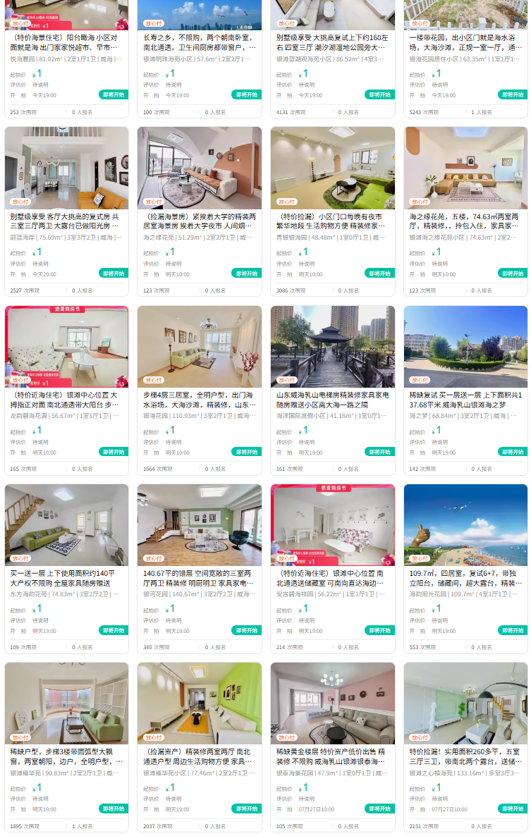 这些房源大多数来自山东威海,共计216套,均为乳山的海景房,且并非集中在某一个小区。逾90个小区均有1元海景房起拍,且大多数房源为精装修、家具齐全。当前乳山二手房价已经降至2000元/平方米,小户型单套挂牌单价已降至7万元以下,且基本没有新房开发,二手房市场供过于求,为了提高周转效率,部分卖方选择以1元起拍。