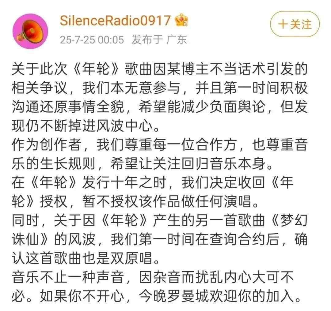 汪苏泷方发文称:“在《年轮》发行十年之时,我们决定收回《年轮》授权,暂不授权该作品做任何演唱。”