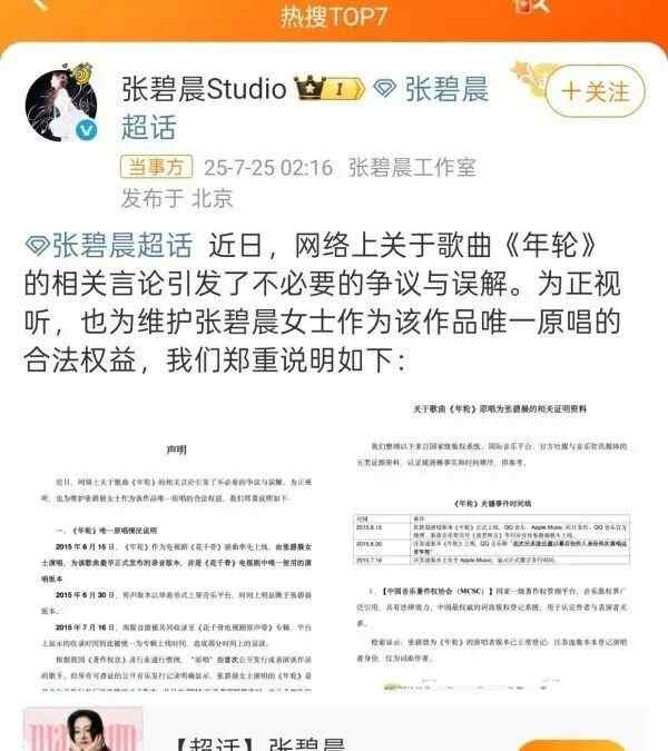 7月25日,@张碧晨Studio 发文回应:“1.经查阅张碧晨女士原经纪代理方与制作方签署的正式合约,我方艺人张碧晨依法享有该歌曲在全球范围内的永久演唱的权利。