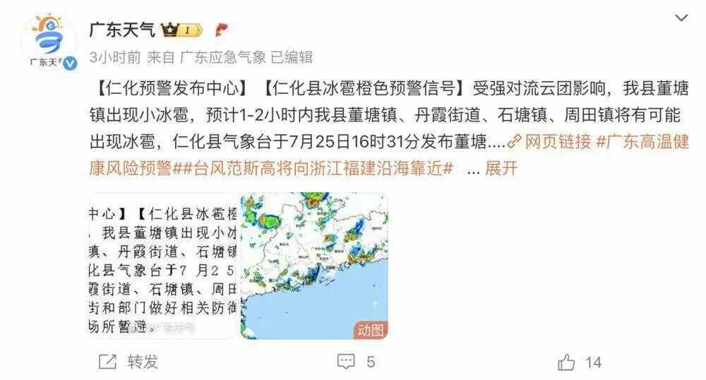 7月25日,广东仁化一度发布冰雹橙色预警信号 截图自新浪微博@广东天气