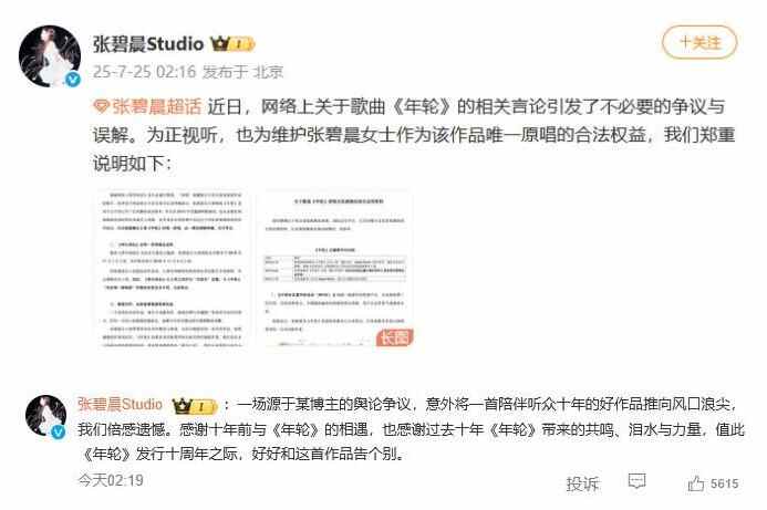 随后,张碧晨工作室发布相关说明称“张碧晨女士为该作品唯一原唱”,并在评论区留言称,“值此《年轮》发行十周年之际,好好和这首作品告个别。”